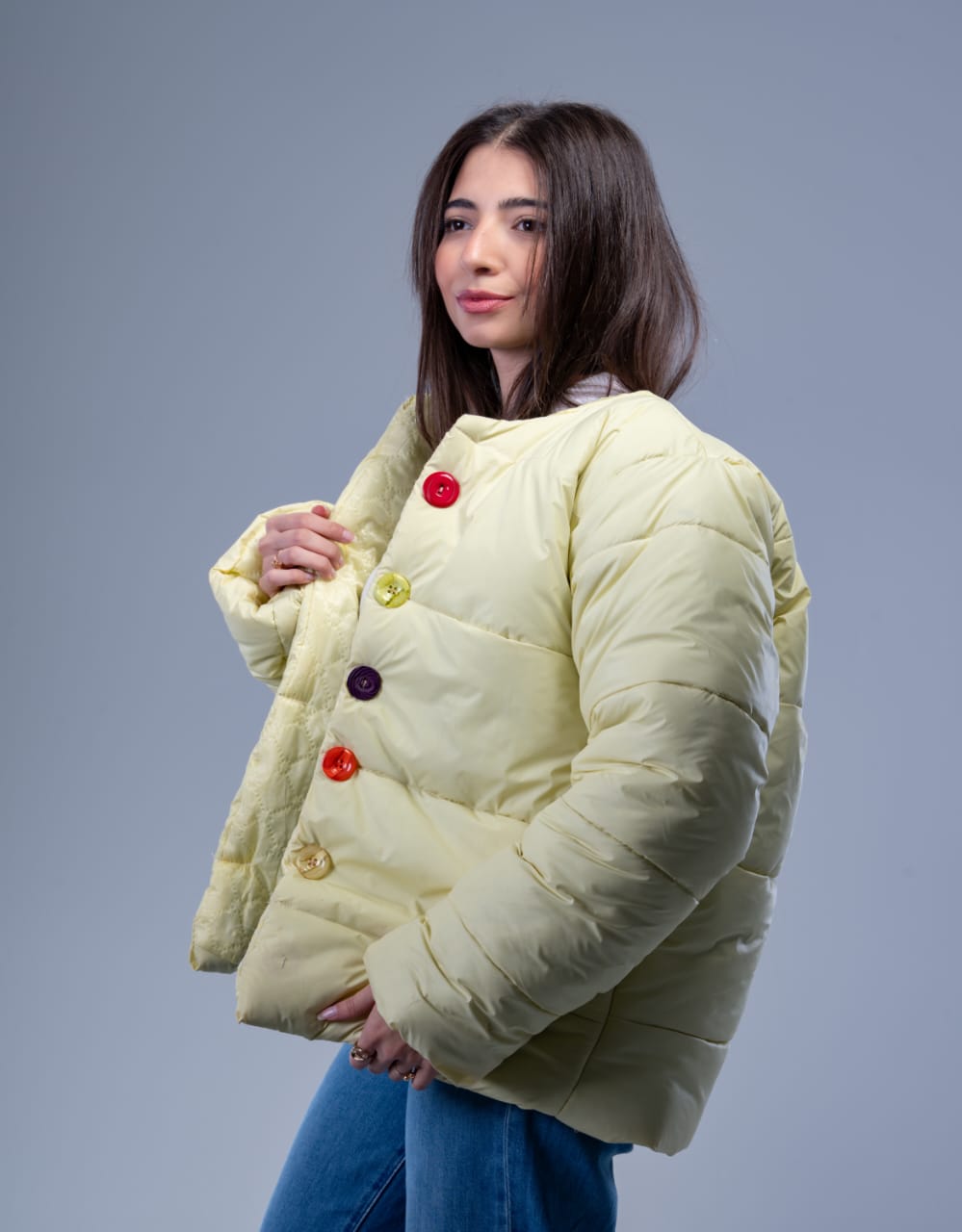 مزود بأزرار ألوان مختلفة تضيف لمسة شيك وعصرية، وتخلي الجاكيت ليه طابع مميز وراقي.