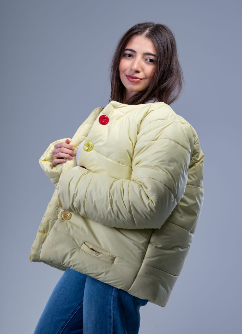 A chic waterproof women’s jacket designed in a stylish yellow shade, featuring multi-colored buttons that add a playful yet elegant touch.