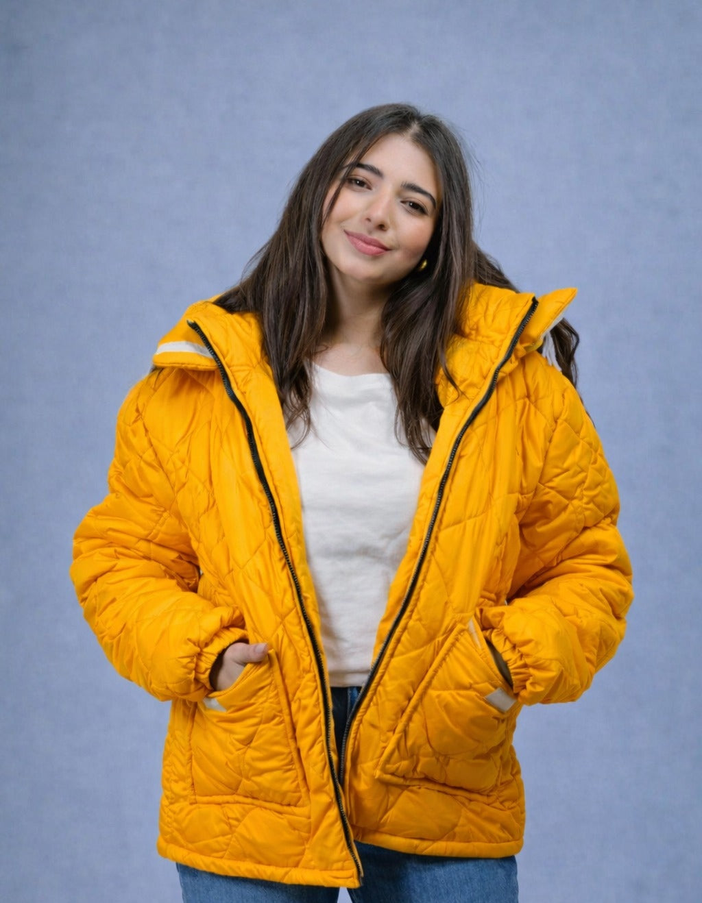 جاكيت أورانج وتر بروف بخامة قوية ضد المطر، متبطّن فيبر دافي، ومع كابيشو عالي بلمسة مميزة تعكس فخامة البراند.