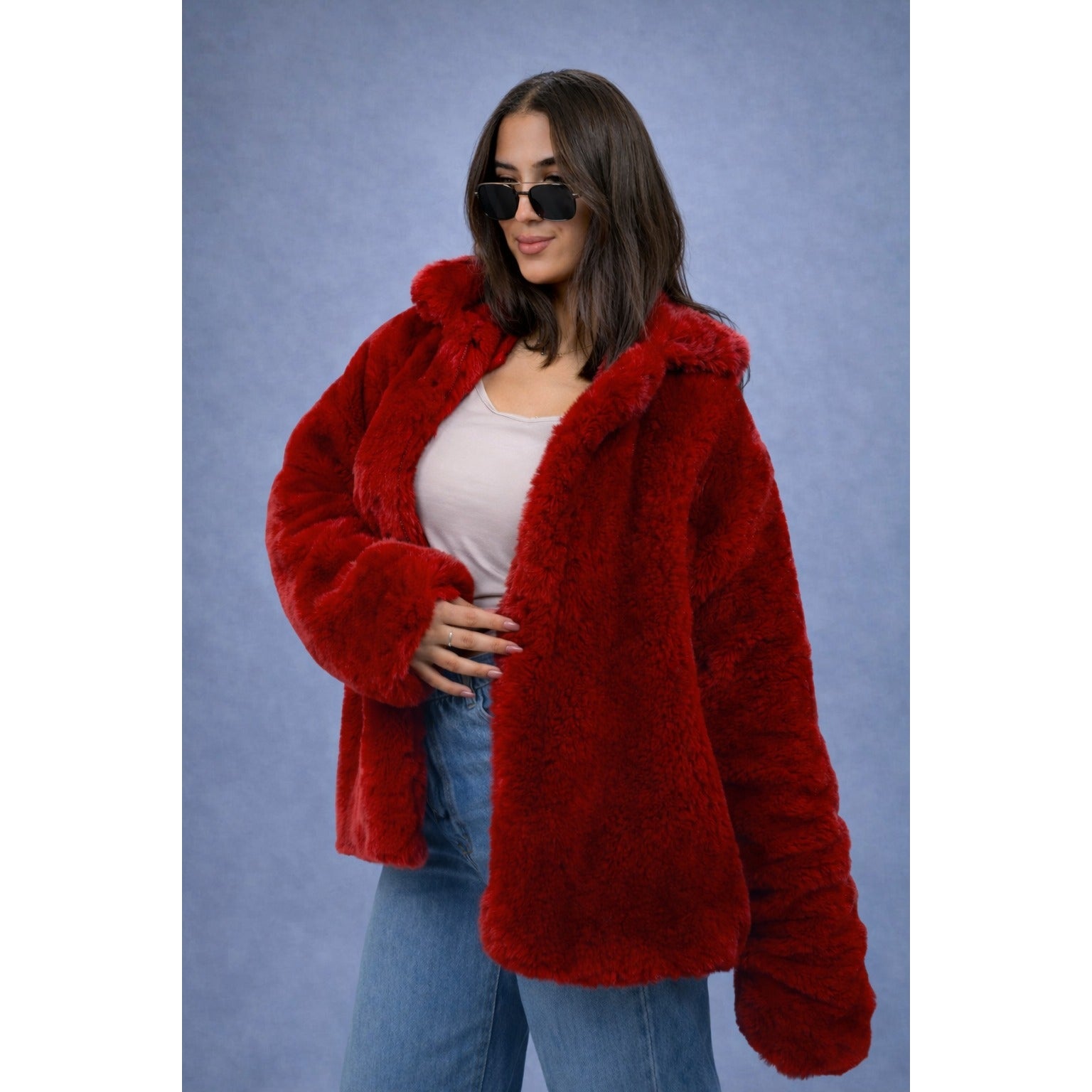 جاكيت فرو باللون الأحمر البرغندي بتصميم راقٍ وملمس ناعم، مزوّد بياقة عريضة وأكمام واسعة تضيف للقطعة حجم وأناقة مميزة.