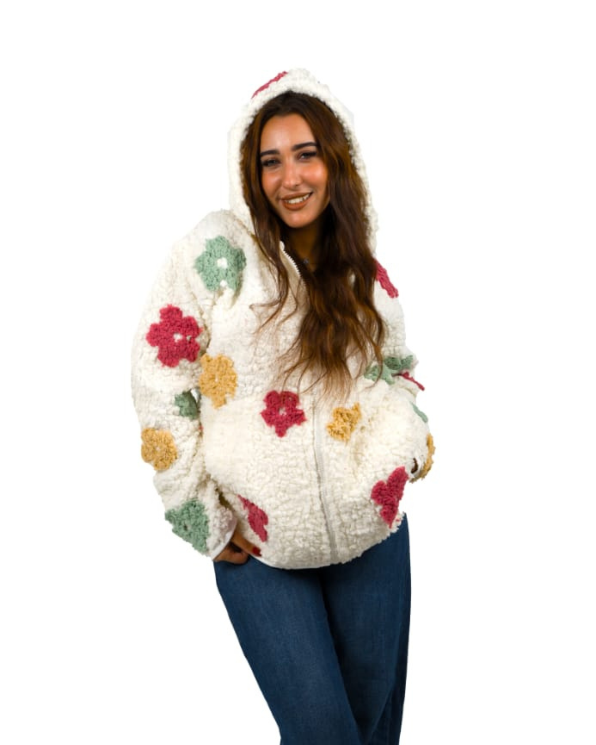 A luxurious white faux-fur jacket adorned with refined floral embroidery. Designed with exceptional craftsmanship, offering superior warmth and comfort. Features a practical hood and side pockets while maintaining an elevated, elegant look. A standout winter piece that brings sophistication and distinction to any outfit.