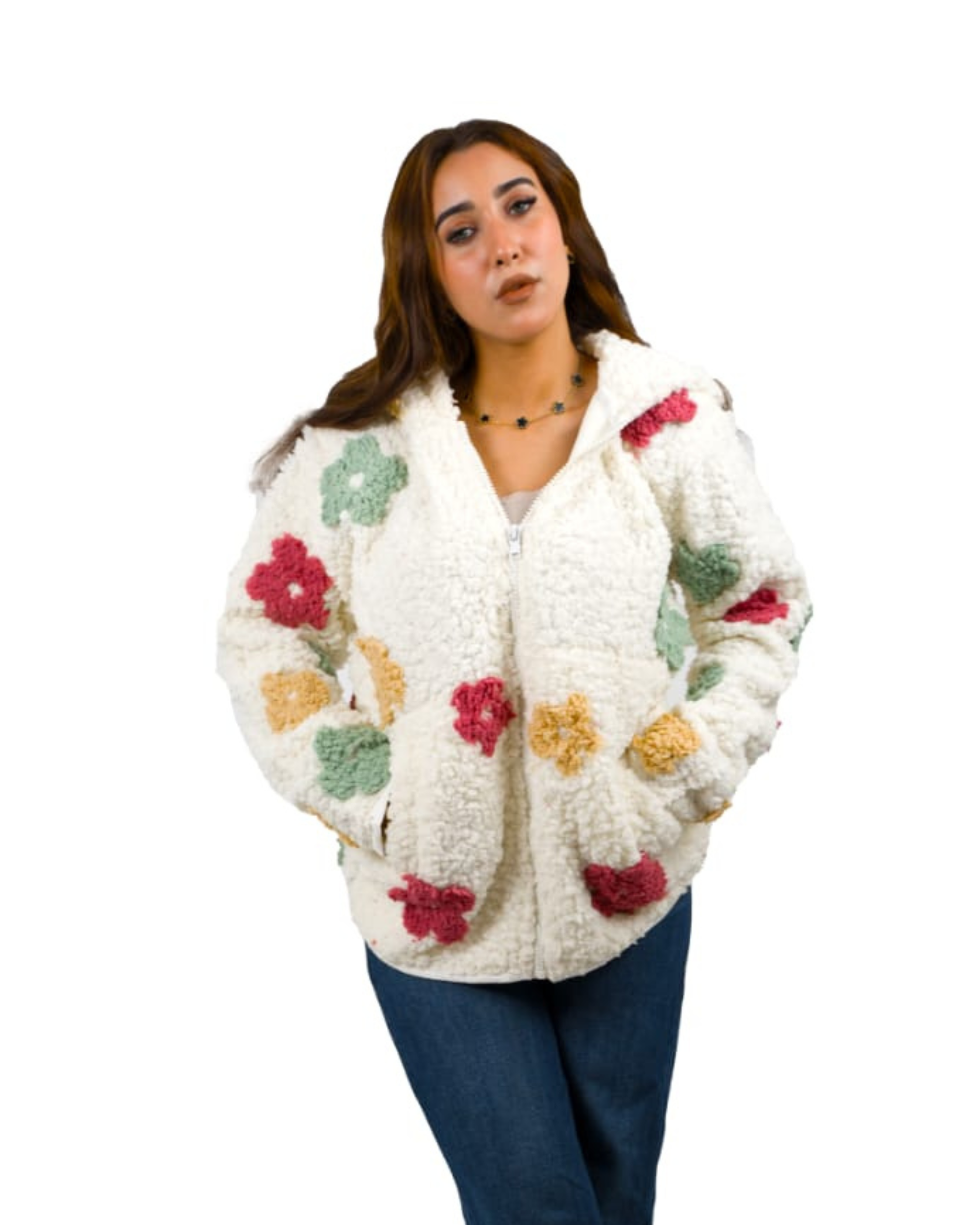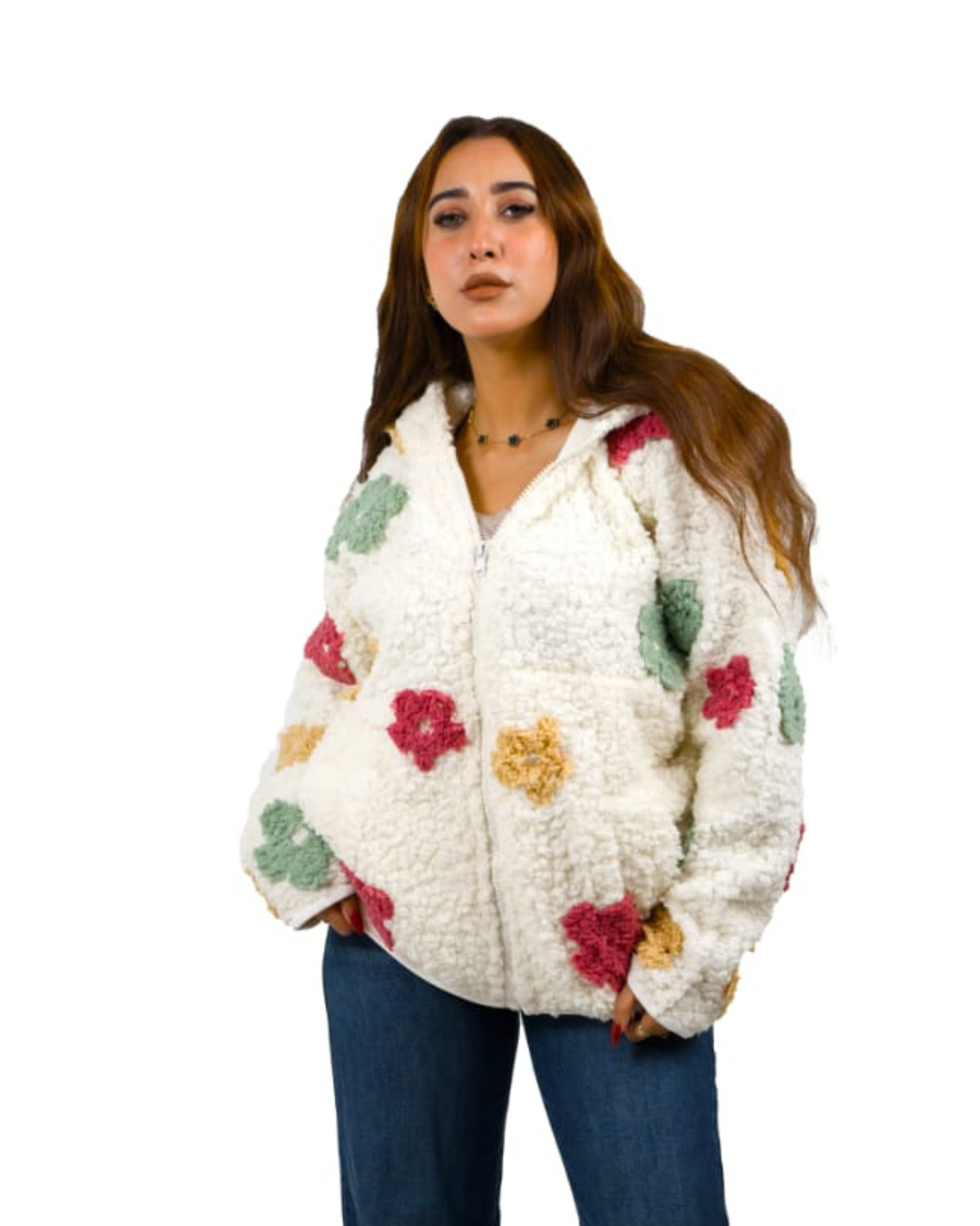جاكيت فرو أبيض بتطريزات ورد مميزة، قطعة راقية بتصميم استثنائي يعكس فخامة الخامة وأناقة التفاصيل يتميز بملمس دافئ ومريح، مع كابيشو عملي وجيوب جانبية تضيف لمسة من الاستخدام السهل بدون التأثير على الشكل الفاخر اختيار مثالي لإطلالة شتوية أنيقة تعكس الذوق الرفيع وتفرّقك في كل خروجة.