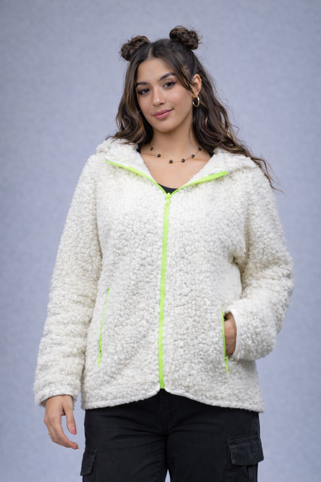 Features a double faux-fur hood for an elevated touch, paired with a bold lemon-yellow front zipper and two matching side zippers for style and practicality.