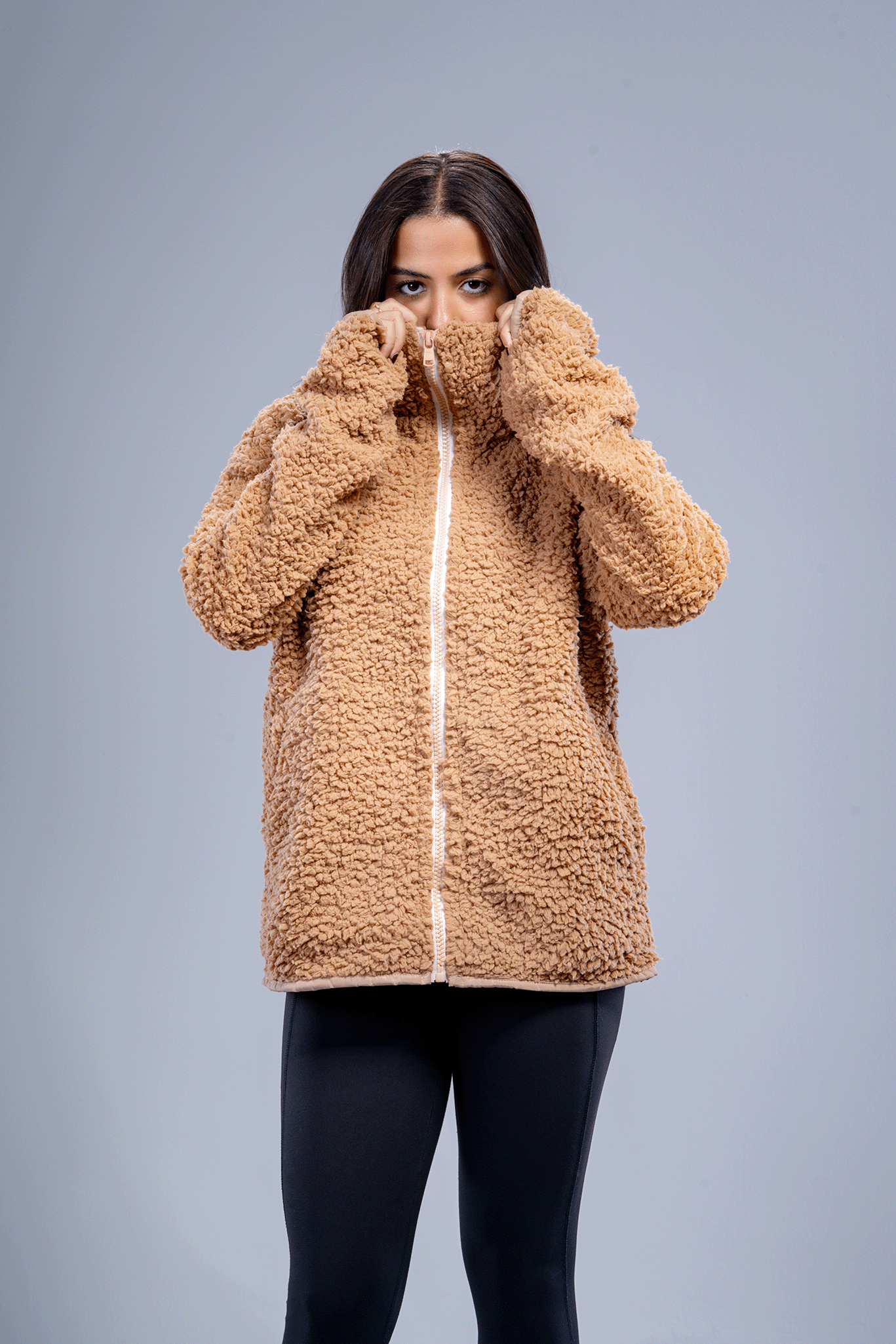 خامة ناعمة وعالية الجودة، مع تصميم Oversize يضيف لمسة عصرية وجذابة، مع سوستة أمامية وياقة أنيقة لتكملة الإطلالة.