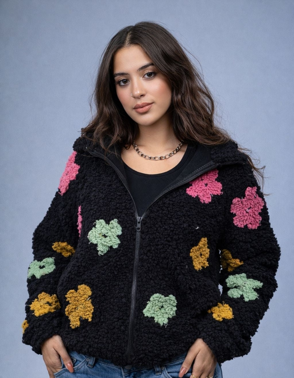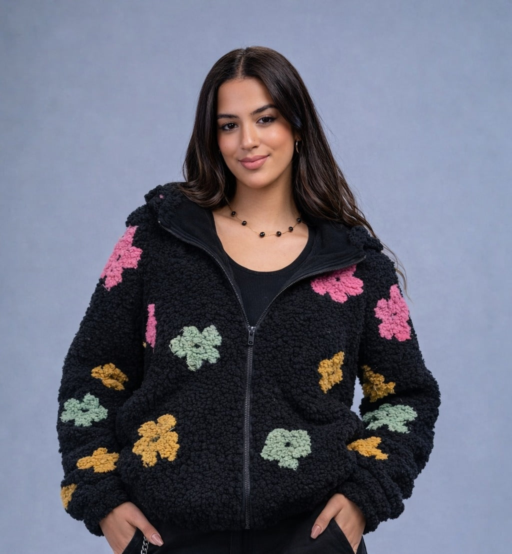 A luxurious Black faux-fur jacket adorned with refined floral embroidery. Designed with exceptional craftsmanship, offering superior warmth and comfort. Features a practical hood and side pockets while maintaining an elevated, elegant look. A standout winter piece that brings sophistication and distinction to any outfit.